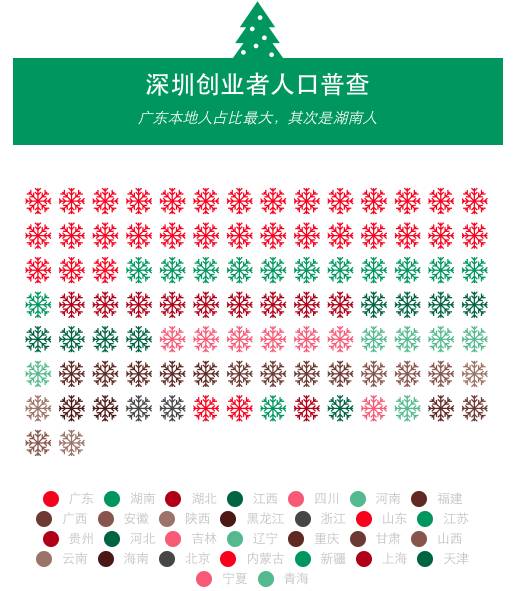 深圳市标准技术研究院大数据观收录的深圳创业者数据显示,截至2015年12月,深圳市创业者男女比例约为7:3,31—35岁为创业者的黄金「时段」,广东人依然是深圳创业的主力军。商业的浪潮中,男性弄潮儿占据多数,但深圳的女性创业者,美啦创始人张博、蓝思科技创始人周群飞也掀起了不小的风浪。男+女,老+少,全国各地人合并成了一个「创客之城」。