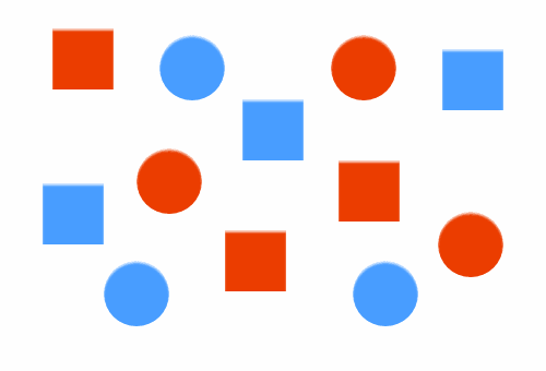 等同我们人类的另一个生存机制,除了让我们察觉不同,也让我们注意到相同。这让我们能辨认出哪些是我们应该相信的,从而区别于潜在的危险。对等同有着较强的觉知力,这就是为什么人类能很快认出各种模式。模式帮助我们理解周围的世界,提供信息并且快速掌握规律,当形成习惯就能变作我们的直觉和本能。 当我们设计两个或多个同类元素时,我们就在暗示,如果其中一个为真,另外那几个等同的元素也为真。如果一个元素重要,其他几个也同样重要。如果其中一个元素可点击,那么其他几个视觉上类似的元素也可点击。这就是我们这样在大段文字当中识别出哪里是链接。视觉对比使得链接文字和其他文字不同吸引你的注意,同时,其他有链接的文字的类似也提醒了你,如果其中一个链接可点击,其他的也一样可以。 同等能显示出几个元素间存在某种联系。它能给你的设计带来熟悉和一致感。 同等让我们组织信息能力日臻完美。当我们环顾视觉环境,并要对其加以理解,我们自然而然会将所有事物进行分类,以此掌握更多的信息,用记忆的形式存储起来。让它变成我们的长期记忆,以备以后分析问题解决问题而使用。 将相同信息的地方设计得外观上也相似,这将会帮助用户处理和理解信息,而这也正是我们设计的目标。 元素中的基础特性共同点越多,它们看上去就越等同,从而也就有更多用户认为它们是相同的。它们看上去在某方面成为同类,即使它们只有其中唯一一个特性相同。 我们用等同去构建系统性和模式。任何两个元素的等同都会暗示着它们也许是一个系统。如果再在这个系统里增加一些同类元素,那么就会演变成为一种模式,在视觉上它会形成图案、纹理或者具有节奏感的视觉效果。 不是所有看上去相似的信号都是等同的。如下图所示,你是通过形状或是颜色来分类图形?你看见的是一组圆形和一组方形图形?或者,你看见的是红色图形和蓝色图形?
