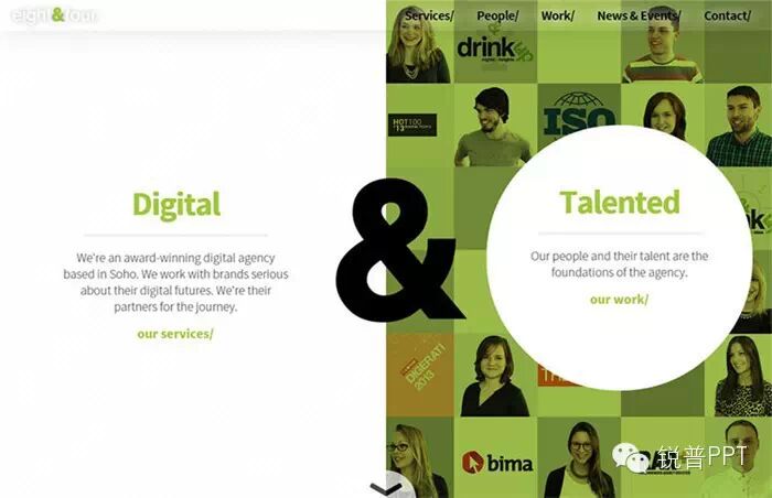 原因之二,有时你要表现出一种重要的两重性。以Eight and Four网站为例。他们在此要表达的是,他们的核心竞争力来自植根数字领域,还有多才多艺的员工。这两点成就了他们。通过屏幕分割来表现这一点,是种令人愉快的方式。