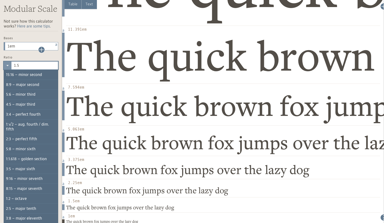 现实上黄金比例的字号对比在移动端是一个适合凸起主题的比例,是一个“美”的比例,但并不肯定是一种适合阅读的比例。一个以阅读为主的网页在字号选择上可能必要较小的比例,若是你在字号的选择上缺乏信念,也可以用一些工具进行辅助选择,比如Modular Scale(Adobe的排版负责人Tim Brown创建的工具),其中囊括了历史上最令人写意的几种比例关系,通过这个比例进行匹配至少可以保证不出错。