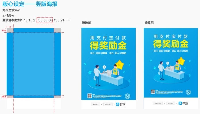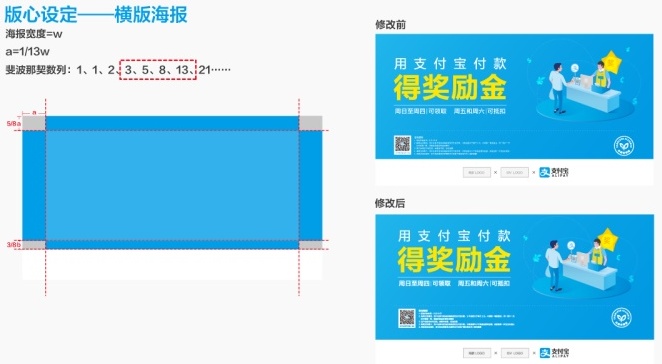 物料的版心设定以物料的宽度为基准,行使斐波那契数列计算出周围留白的区域。