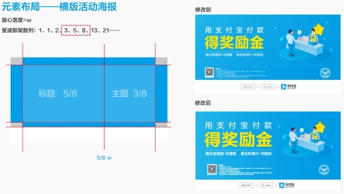 元素布局——横版活动海报:版心的宽度为 w,划分为8小份,按照5/8和3/8的比例分为两份,题目区域占5/8,主图占3/8。