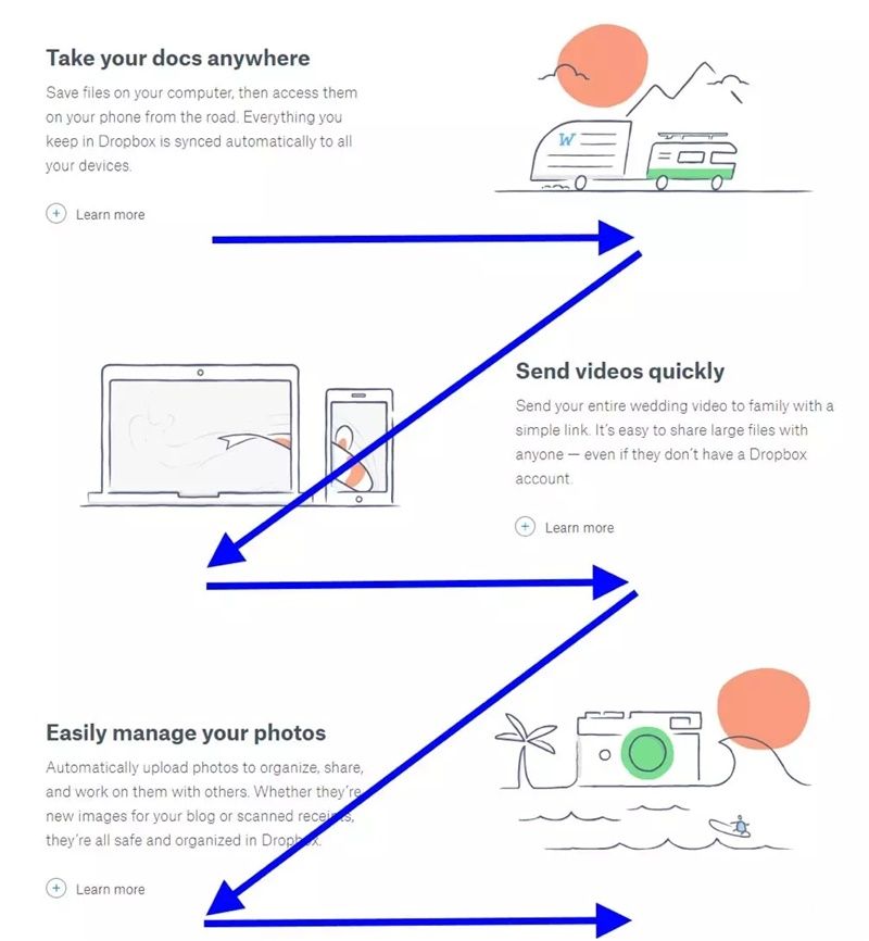 从字面意思可以看出,Z形布局是沿着 Z 的图形追踪,用户在扫描时候从左到右,从上到下,这是眼睛在网页中的天然移动模式。