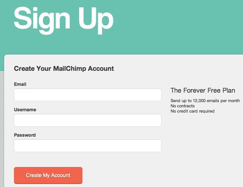 与之相反,MailChimp 的核心数据像素率把握的很好. 言简意赅介绍网页的功能; 大块的输入框和明确的指示文字标识保证用户能够很快地填写完注册页面; 准确的文字提示告诉你注册的具体内容; 然后注册按键显目:大,颜色鲜明对比。