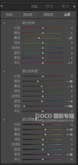 2)放大图片发现有一点紫边,而紫色在这组图片中不会影响人物和环境,所以直接在LR里降低紫色饱和度并且进步亮度。