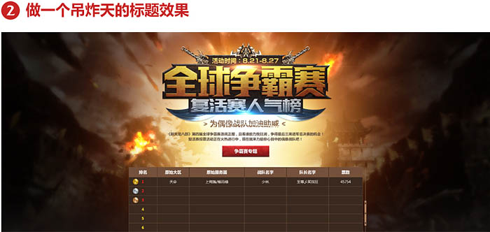 10、先对文字按照主次关系进行排版,这里同样最好采用居中的形式。“全球争霸赛”这几个字是同事之前做好的变形,我这里直接拿来用了,文字变形不是本次教程的重点,所以这里不做详细介绍,感兴趣的可以看下畅游VC关于文字变形的教程。
