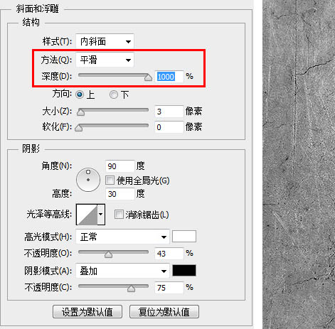 12、应用斜面和浮雕时要注意“方法和深度”的值,建议大家自己去不断调节体验一下变化之处。我这边通常用到这个效果的时候是分别选为“平滑”和“1000”,可以使斜面的分割清晰而且不会出现杂边。