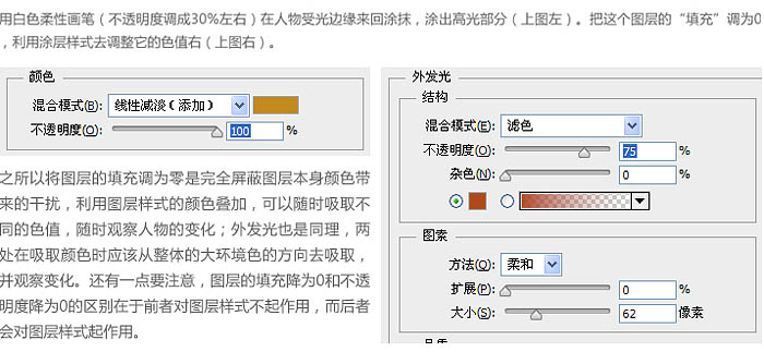 19、对人物左侧的背景再次提亮,通过柔性画笔去叠加,或者通过图层样式吸取环境色去调节(图左)。在人物的最上方创建剪切蒙版,从左上方帽檐处向右下方拉白色到透明的渐变,填充调为零,利用图层样式调整颜色给人物进一步增加环境色亮光,使人物的受光面从左上至右下方逐渐减弱(图右)。