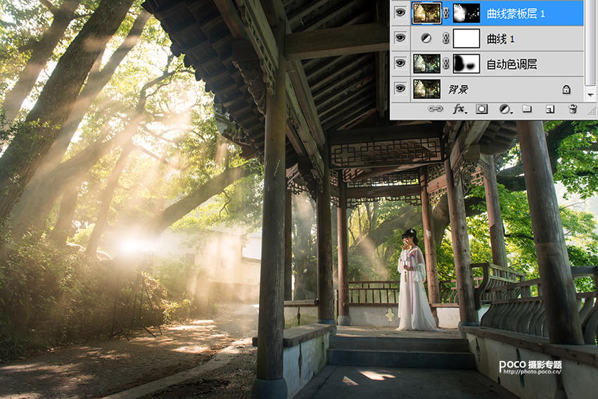 (5)执行“Shift+Ctrl+Alt E”加盖图章,建立新的“曲线图层”,并点击图层工具栏中的正向蒙板,再次用黑色笔刷对图层中的暖色和高光区域刷出还原原片中的暖色;