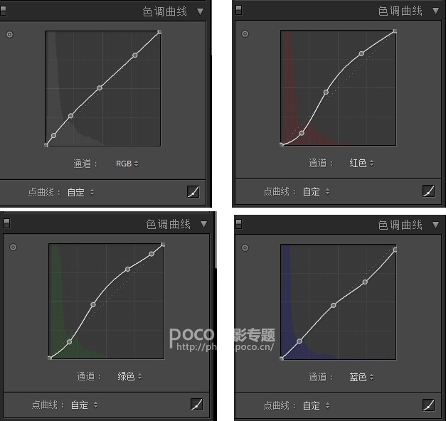 如下图所示,蓝、红、绿通道分别调出一个小S型的胶片曲线,如许的调重要是增长画面中亮部和暗部的色彩对比。