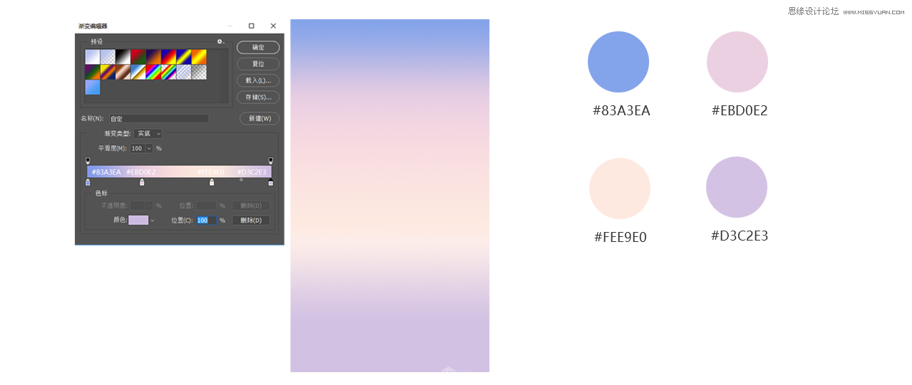 2在画布上给画面一个背景颜色,背景颜色在前期构想中就要有个想法,大致要什么样的颜色。渐变色填充整个背景,背景色彩会主导整个画面颜色方向渐变数值为:#83a3ea #ebd0e2 #fee9e0 #d3c2e3