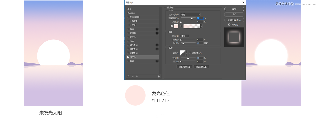 5绘制阳光在AI中绘制了一个阳光,拖拽到PS中,阳光填充颜色:#fffff 阳光在PS中显得比较突兀,和整体不融合,这样就需要给圆做一个外发光。选中阳光图层右键-混合选项-外发光,混合模式:滤色、不透明度75%、图素大小:27,方法:柔和,颜色:#ffe7e3