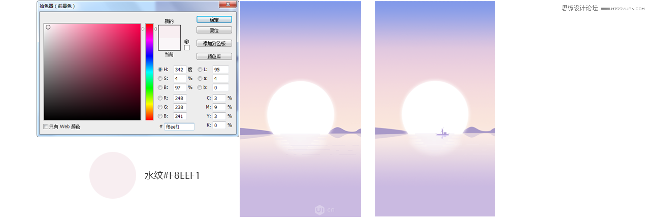 4绘制小山可在PS中或者AI中绘制,哪个方便就用哪个,没有特意要求,把小山放在天水分割线处,给小山颜色#b2a2cc 然后复制出一层小山作为倒影,颜色#e6d6e0