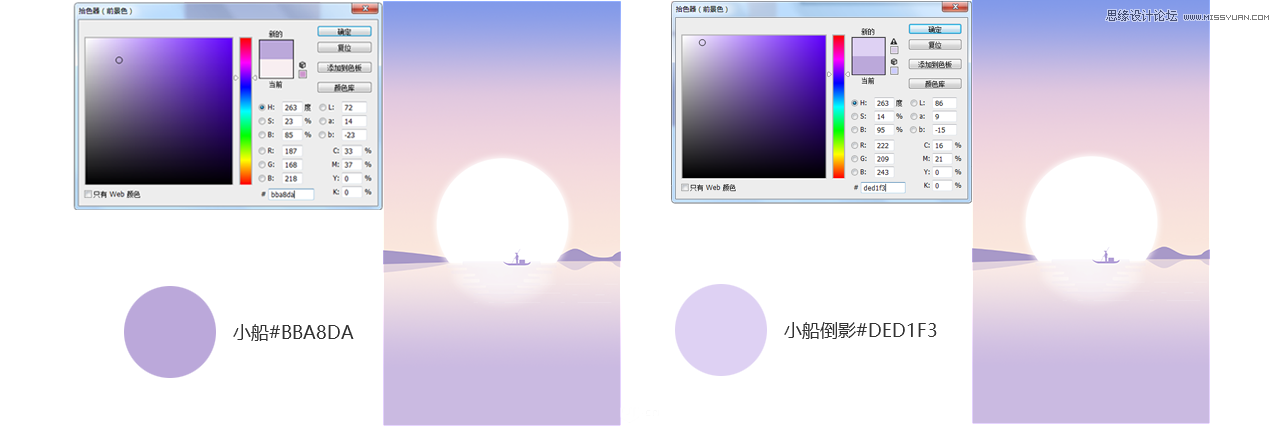 9.湖面也处理差不多了、那么给整个画面增加一些辅助气氛、在AI中画的小船渔夫导入到画面中,摆放好位置,给小船一个颜色#bba8da,这样小船感觉像在空中飘着,紧接着给小船一个阴影让小船有一个厚重感是在海面上飘着的。复制一层小船,然后旋转把小船压扁一些感觉像个倒影、给小船阴影一个颜色#ded1f3。