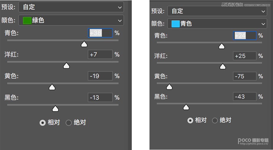 在这里重要调整可选颜色重的绿色和青色,都是加青色,减去洋红,同时减去黄色以及黑色,原理就是让图变得更青。洋红色对应的绿色,加洋红就减绿,黄色对应蓝色,减去黄色就加蓝,同时要减去一