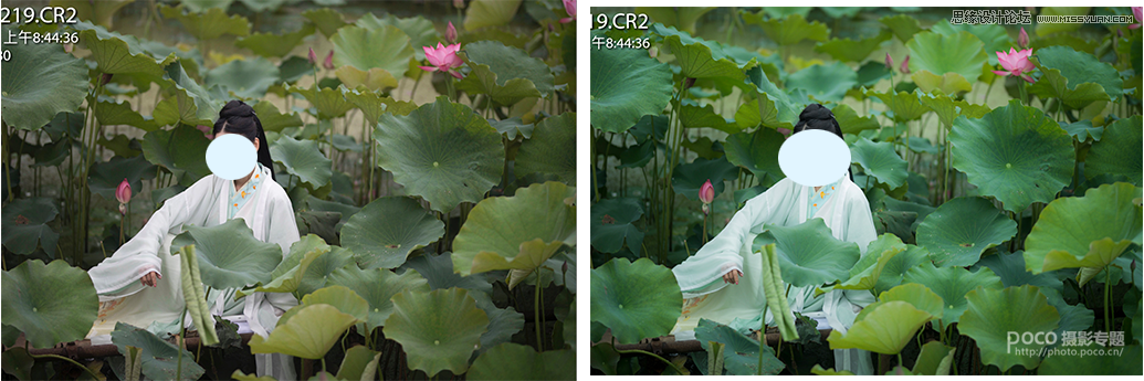 第四步是对团体进行调色,同时也是最紧张的,重要是荷叶的颜色必要进行调整。在绿色上,往黄色方向调整一些,同时降低饱和度 ,进步通亮度,浅绿色上往蓝色调调整,降低饱和度以及降低通亮度,如许片子就会形成蓝黄对比,明暗对比,会有条理感。橙色和红色重要控制肤色,进步橙色通亮度,使肤色更白一些,我小我喜好橙红色的口红,所以把红色色相右移绿一下。接下来看对比图。