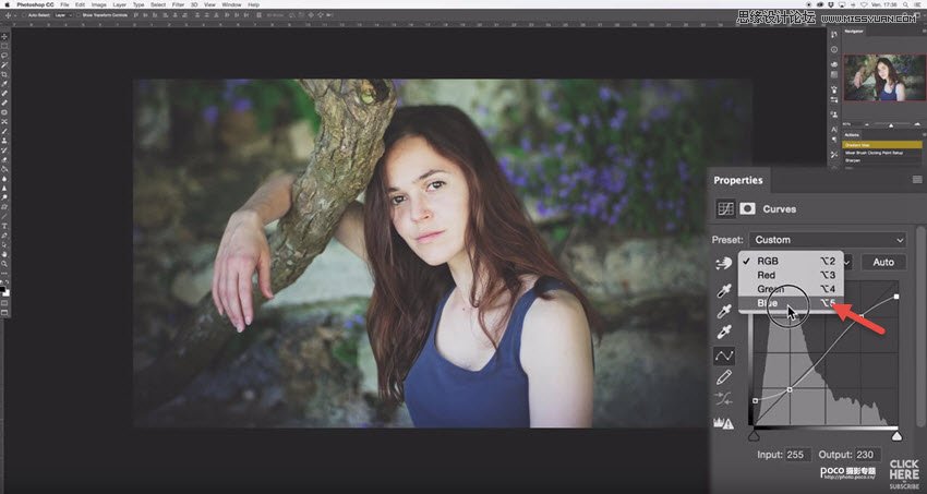 (5)胶片除了大宽容度,另一大特点就是独具韵味的色偏。将RGB通道切换为Blue通道。