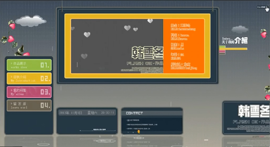 然后里边有很多细节比如这个自我介绍,你看这些字啊用得很不讲究,具体什么字体我也不清楚。然后每个里面都有动画。这个按钮他有一个热气,就这一个热气我找了两天的时间。我想让他冒个气但不知道怎么来弄,找了差不多两天的时间去考虑这一块。比如说这个时间也是找的素材,给他进行拼接。